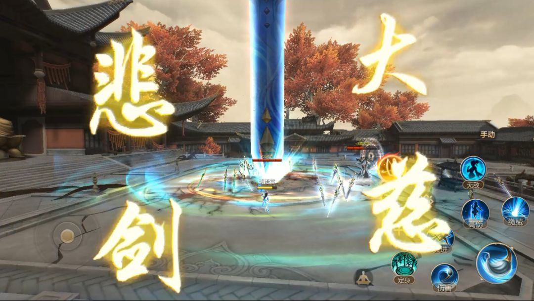 技能效果:白云大师召唤“大慈悲剑”,“大慈悲剑”缓慢下沉,并在没入地面后对全场产生超大伤害,“大慈悲剑”剩余的血量越低,造成的全场伤害就越小。