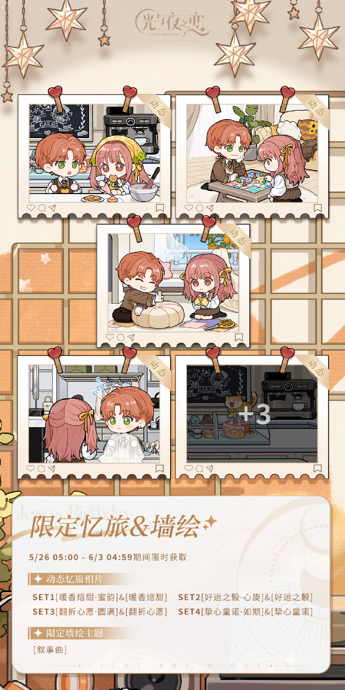 集齐夏鸣星生日系列四组动态忆旅相片后,可在限时计划处领取限定墙绘[叙事曲]。