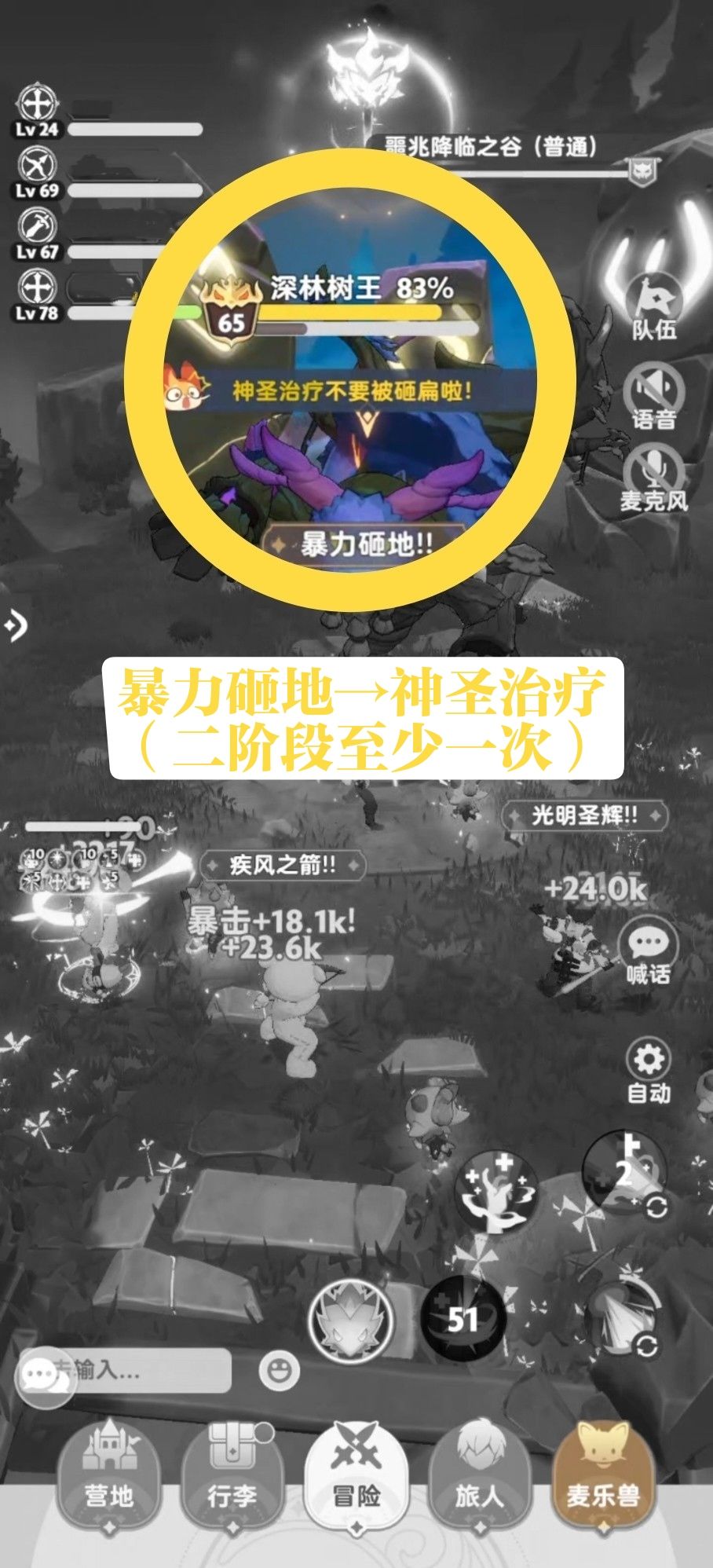 4.boss暴力砸地(麦芬提示+灰条+字,灰条结束前放技能,只出现于二阶段,开头必有,除非输出战力较高,否则不止有一次)→神圣治疗