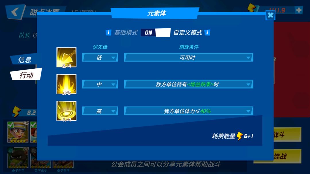 众所周知,为了游戏的策略性,每个角色的技能效果肯定都是不一样的,有的适合给对面人全在的时候使用,有的技能在对方残血时使用效果更佳,因此技能施放的时机就显得很重要了。在《元素裂变》选择上场角色的界面中,长按角色的头像点击左侧的行动即可进入技能AI释放设置界面,打开最上方的自定义模式,即可调整技能释放优先级、释放时机等,根据不同副本设置不同AI策略,能有效避免“翻车”的情况发生。