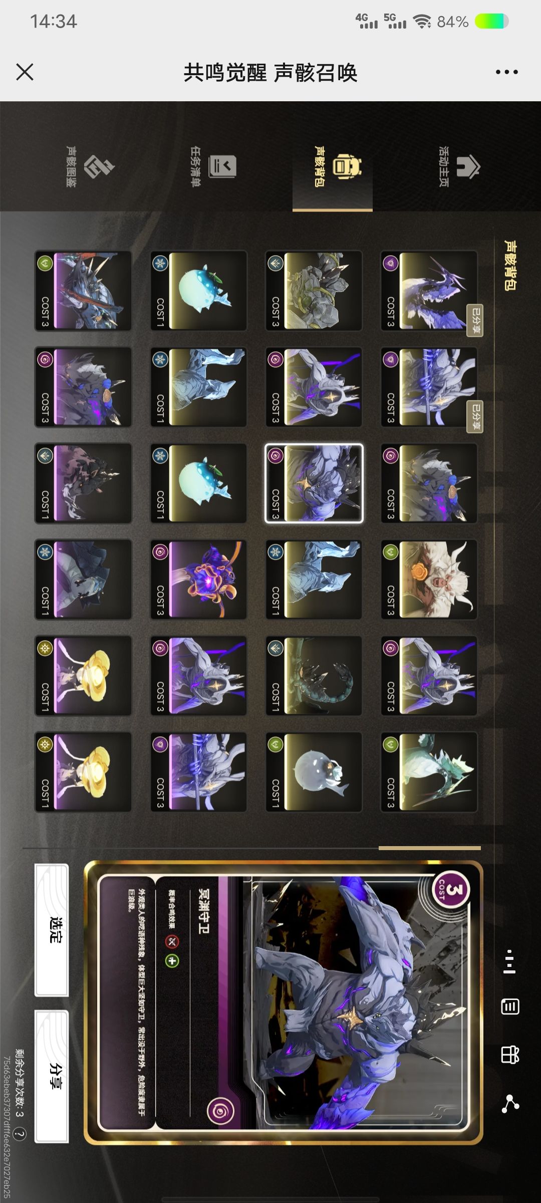 声骸品质:品质有绿、蓝、紫、金,每升五级可获得额外辅音词条。