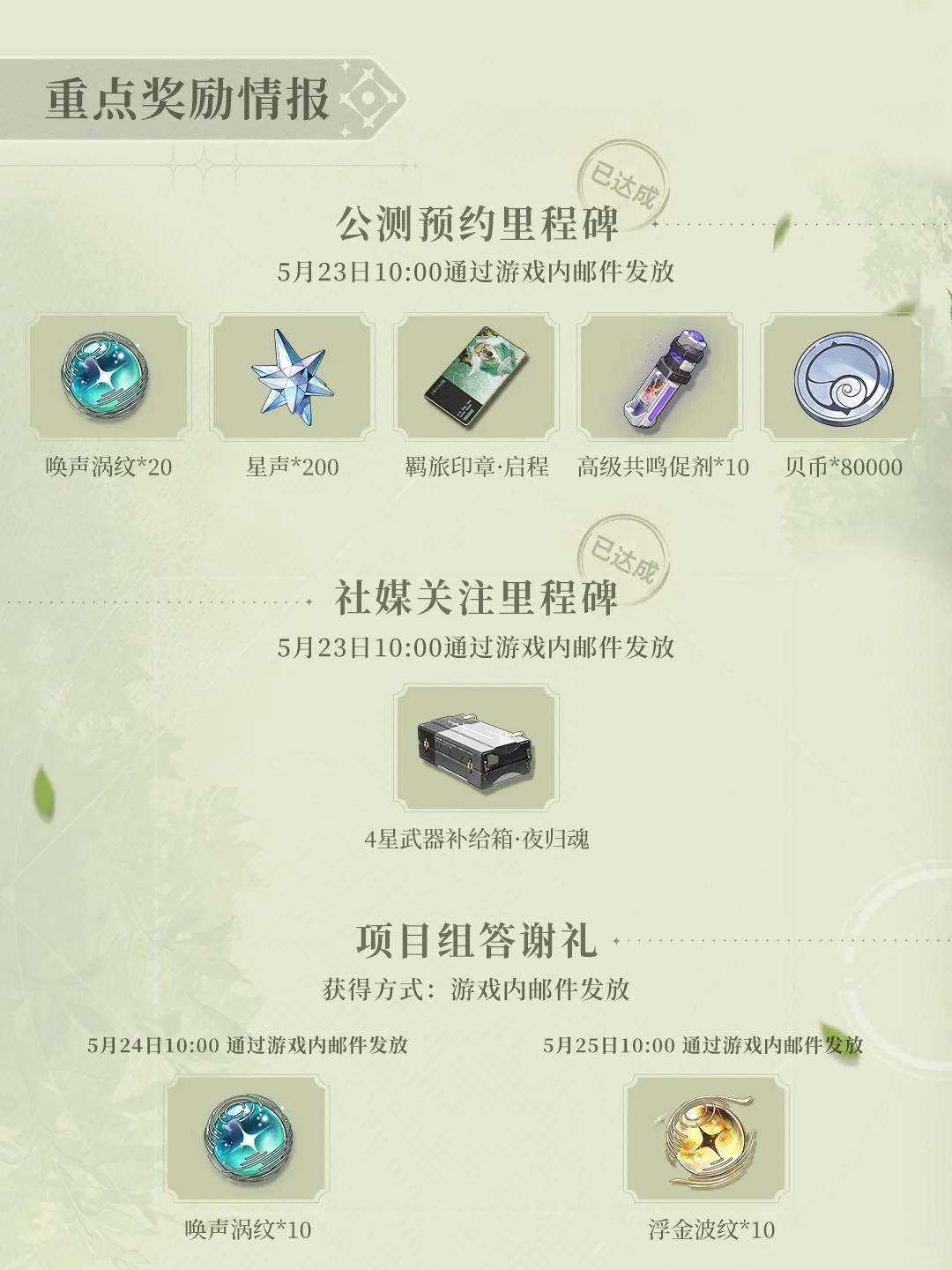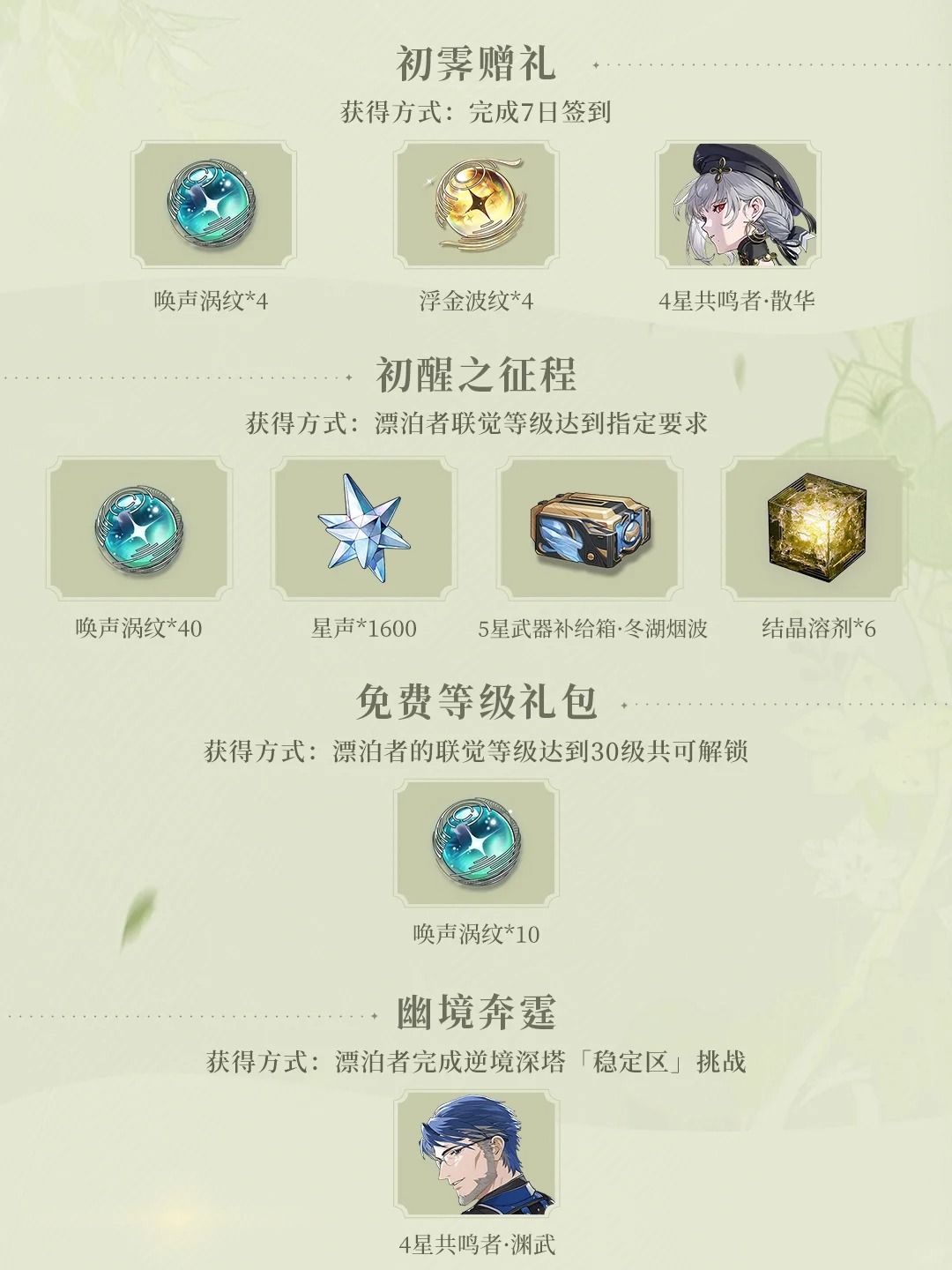 漂泊者们可在游戏内累计免费获取84枚唤声涡纹、14枚浮金波纹、1800枚星声,以及自选5星武器、自选4星武器、羁旅印章·启程、4星共鸣者·散华、4星共鸣者·渊武等珍贵奖励!