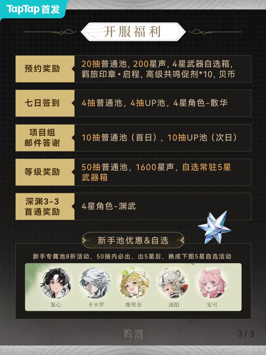 开服福利总结在最后一张图啦,合计84常驻池+14限定池+1800星声(折合11.25抽)+2个四星角色+4、5星常驻武器自选箱。
