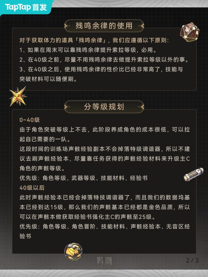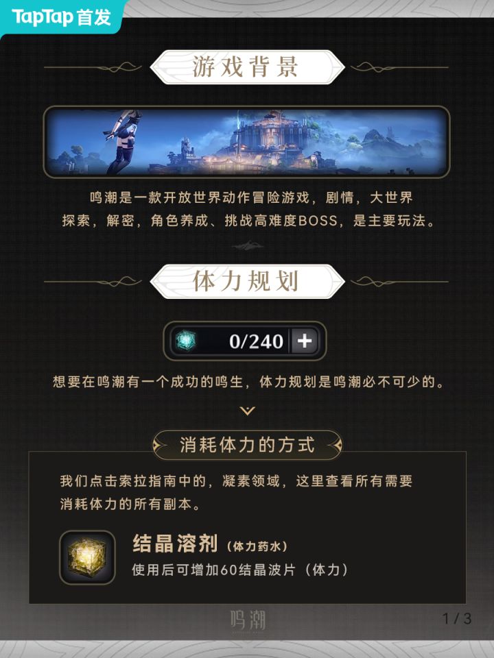 体力药水(结晶溶剂)的使用需要仔细考虑,要点我们总结在图中啦。进游戏后大家先推主线到卡等级,此时模拟训练场适量刷取避免体力溢出即可。之后将重点放在探索大世界和收集声骸提升数据坞(葫芦)等级。鸣潮跑图很快,肝大地图会比较快。等级和数据坞都较高时,此时副本掉落收益较为稳定,再根据队伍情况针对性刷本培养。