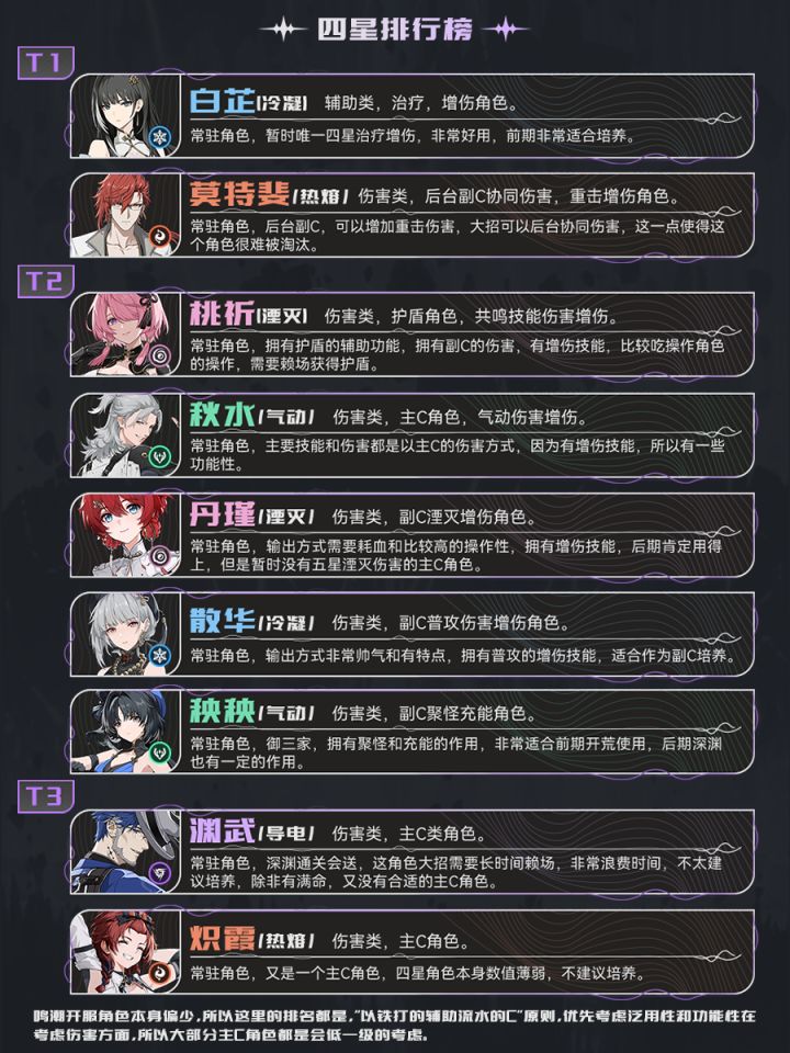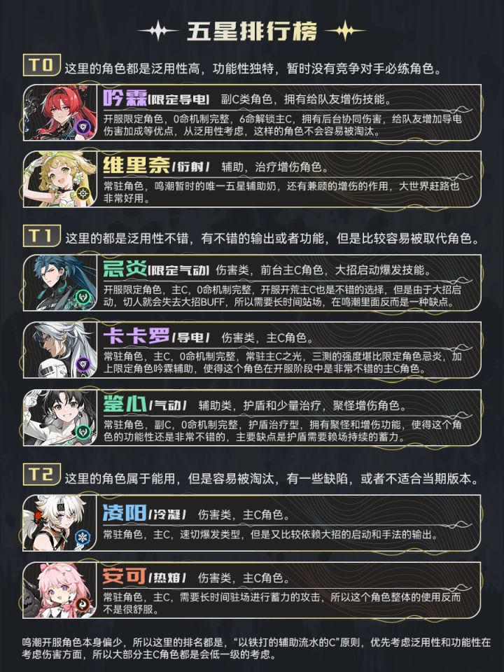 本文是基于3测数据列举的开服角色强度榜。鉴于鸣潮开服角色数量较少(比如治疗角色只有2位),因此强度排优先考虑泛用性和功能性。俗话说的好“铁打的辅助流水的C”。