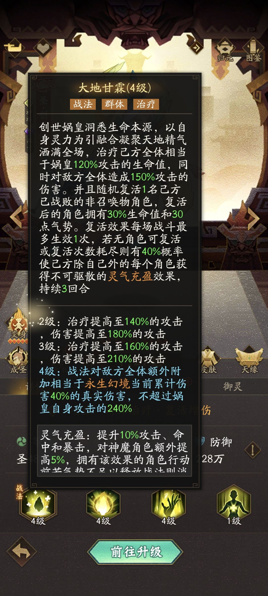 ③娲皇战法:大地甘霖,可复活次数提高至2次,且复活的角色生命值提高至100%,气势提高至100,并且立即行动1次。