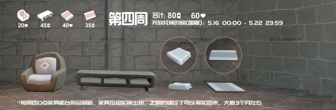 𝟮.筑巢工坊家具柜台每周四刷新,距离下次刷新还剩24小时(今天过完就刷新)。本周家具:单人沙发、矮脚长桌、毛巾摆件、长条纹小地毯