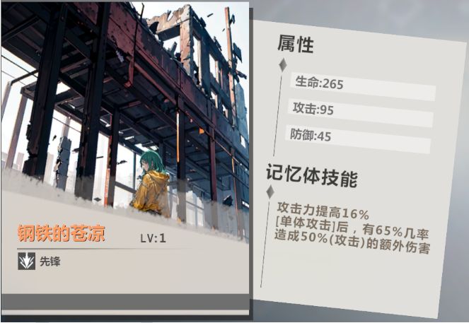 作为印有舞乙形象,与舞乙同池UP的限定橙色记忆体,被称为舞乙专武。从数值上看,这个光锥首先提供暴击率,是比较有用的属性提升,能够提高舞乙的暴击几率,可以让舞乙的攻击更容易打出暴击。接着是提供暴击伤害,让舞乙的伤害上限进一步提高。从功能上看,这个记忆体给舞乙带来的比较特别的提升是可以在暴击之后叠加暴击伤害的机制,搭配舞乙本身被动加上[剑匣]额外多抽牌的效果,可以让舞乙快速叠满4次暴击伤害增幅。整体来说,这个记忆体的输出增益相当不错,非常适合舞乙作为主C使用。推荐二:橙色记忆体「钢铁的苍凉(先锋)」
