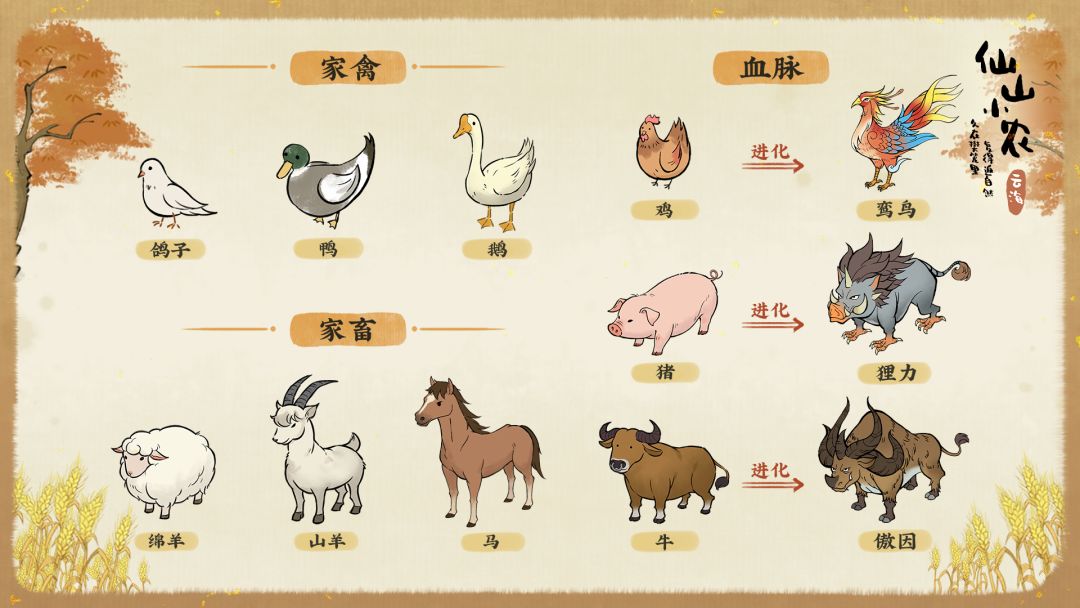 对了,小农们发现仙山某些动物的神奇血脉了吗!三黄鸡可以进化成身披五彩纹的鸾鸟,猪猪可以进化成狸力,狸力身形酷似野猪,却长着鸡爪哦~牛也可以进化成傲因,傲因样子像牛却长着四只角,毛发很长,就像披在身上的蓑衣一样。