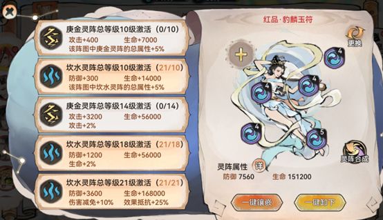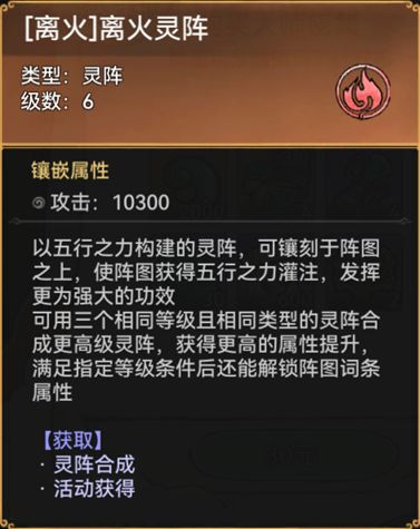 2.灵阵有1-9个等级,可以通过低等级合成高等级,3个1级合成1个2级,以此类推……灵阵本身具有一定属性,金系(生命+攻击)、木系(生命)、水(防御+生命)、火(攻击)、土(防御)。随着灵阵等级的提高,其自身属性也在指数型提高。我们以火系灵阵(8-9级为推算)为例,在6级的时候就可以媲美2星+40攻击古宝的基础攻击力了,当然古宝的百分比属性还是比不上的。