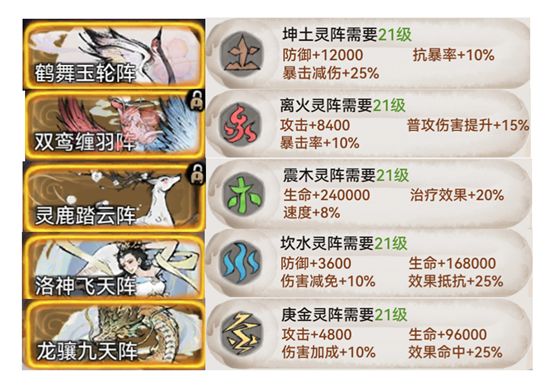 目前开放的阵图共有五种:鹤舞玉轮阵(抗暴、爆减)、双鸾缠羽阵(普攻)、灵鹿踏云阵(速度)、洛神飞天阵(减免、抵抗)、龙骧九天阵(加伤、命中)。