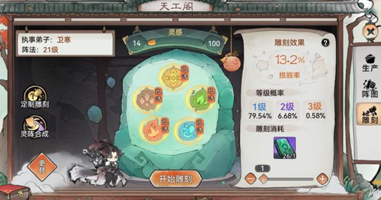 1.阵图上的灵阵主要通过灵阵雕刻获得,雕刻需要消耗灵阵拓片,并且每次雕刻有一定的损毁率。(损毁会获得碎片,通过八卦炉可以再合成灵阵)