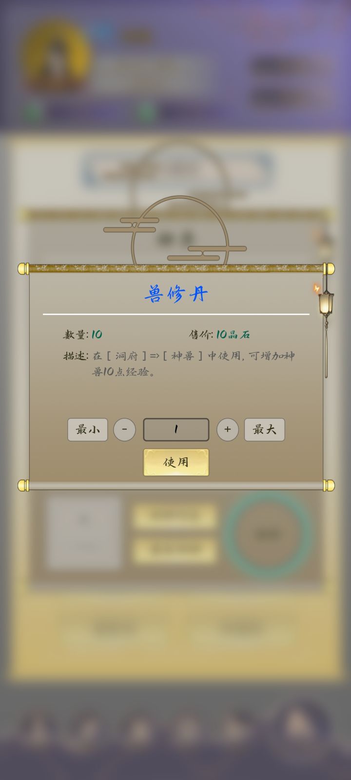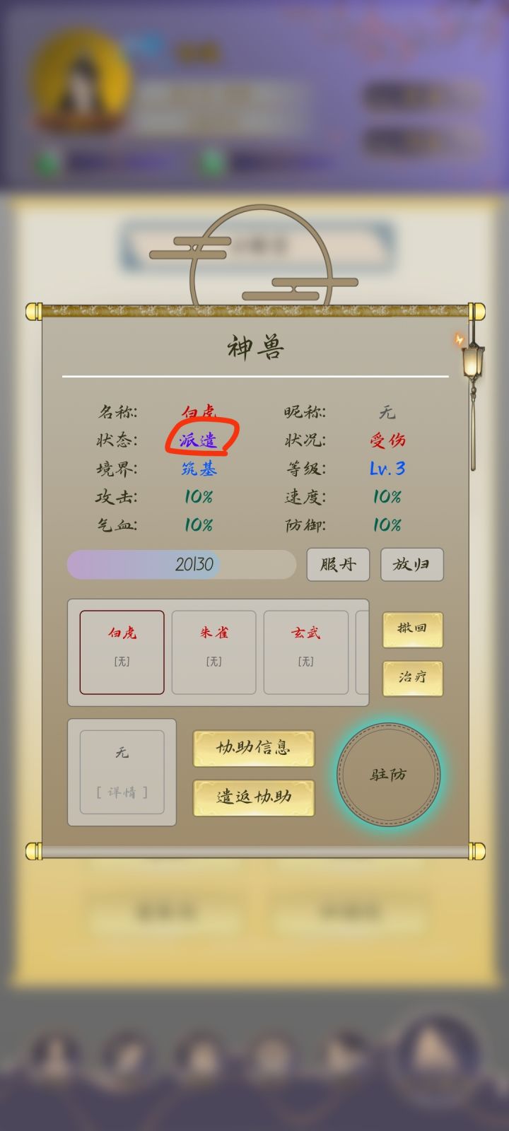关于升级,在神兽界面中选中你要升级的神兽,然后点击服丹,图三界面中使用兽修丹来提升等级和境界,其中当归可以返还一定比例的兽修丹,当你派遣神兽的时候,还可以撤回操作,被派遣的人不需要这个神兽了也可以遣返。