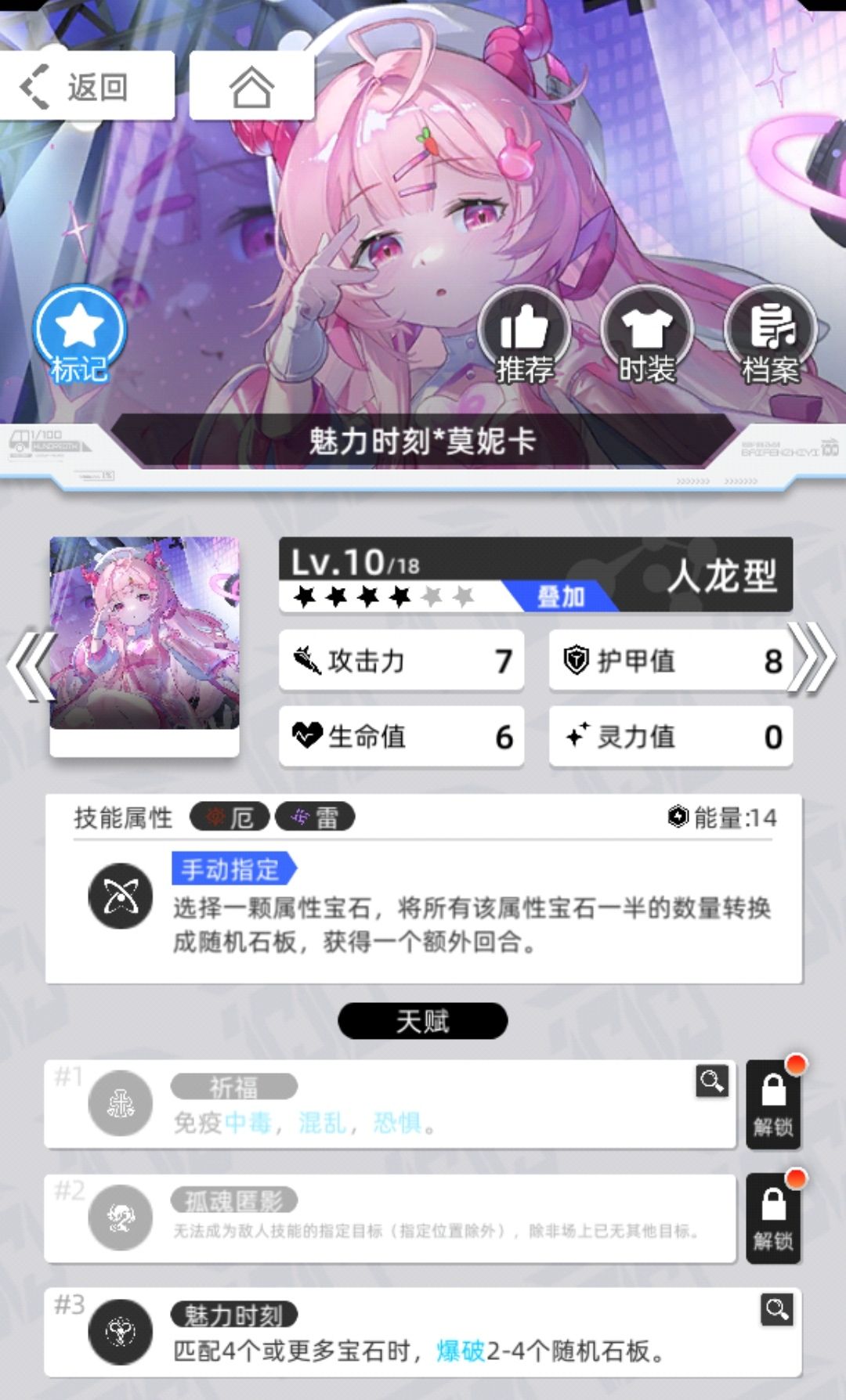 技能是造石板,额外回合。特点是3天赋,4消就爆石板,能消耗石板和充能,还不用游戏少女那种必须1号位触发。