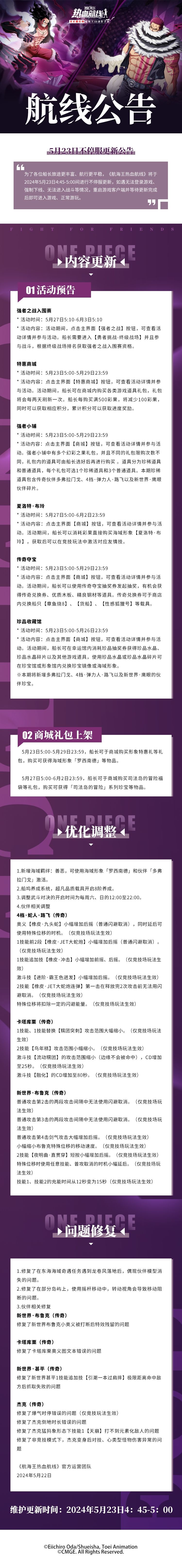 为了各位船长旅途更丰富、航行更平稳,《航海王热血航线》将于2024年5月23日4:45-5:00间进行不停服更新,如遇无法登录游戏、强制下线、无法进入战斗等情况,重启游戏客户端并等待更新完成后即可进入游戏、正常游玩。