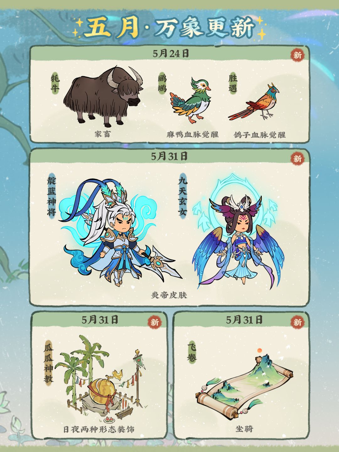 1、新增炎帝皮肤「靛蓝神将」、「九天玄女」与坐骑「飞卷」,均可在宗门交易中兑换。