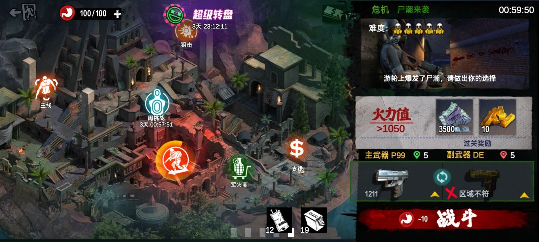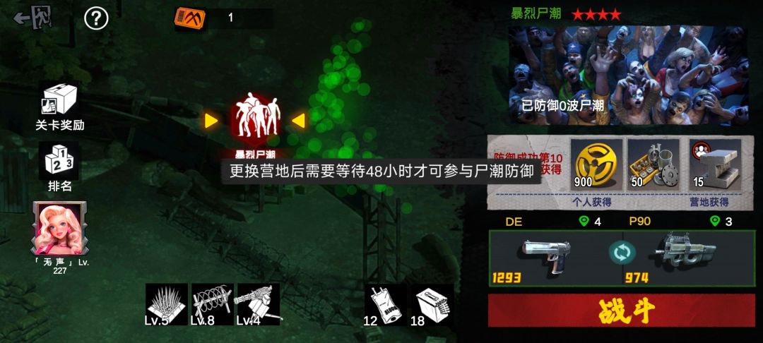 尸潮比较费时间,但奖励也是比较丰富的,所以还是要去打的。(格斗值低就早点打,邀请营地的dalao助战)可以躺着过30-50波