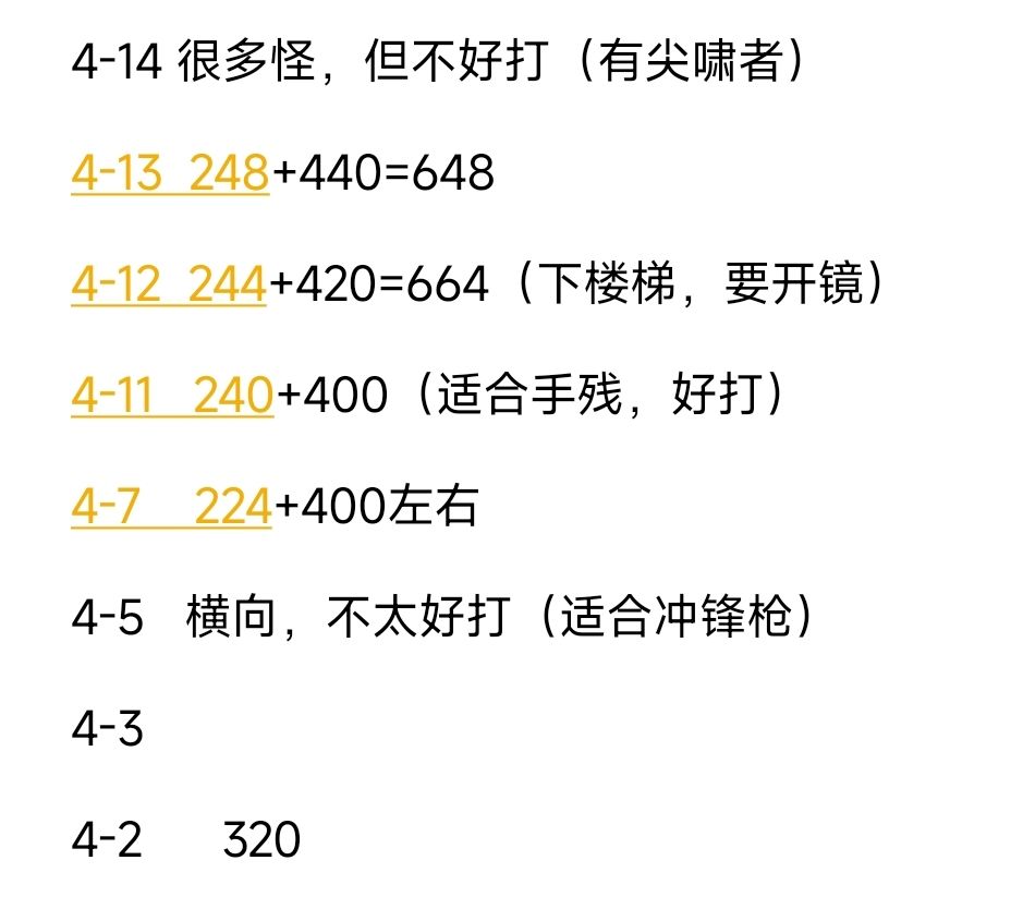 如果直线也卡了,那么可以刷怪多的主线关卡,拿爆头奖励,列出来第四区比较好打的关卡了。