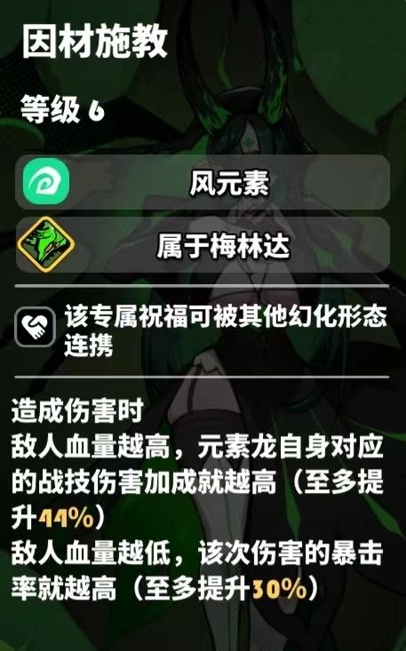 因材施教:该连携祝福可以根据敌人血量来提高自身战技伤害或暴击率,是一个提升不错且通用性极强的连携祝福,需要注意的是在部分关卡内不显示怪物血量的环境默认怪物满血