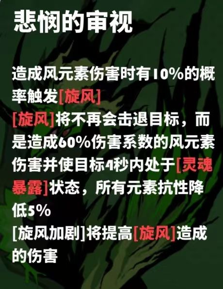 悲悯的审视:梅林达的伤害触发旋风时不再击退目标而是转为造成伤害,同时可以为敌人附加灵魂暴露状态降低敌人全元素抗性,在部分高抗性敌人的环境下能够发挥显著的作用