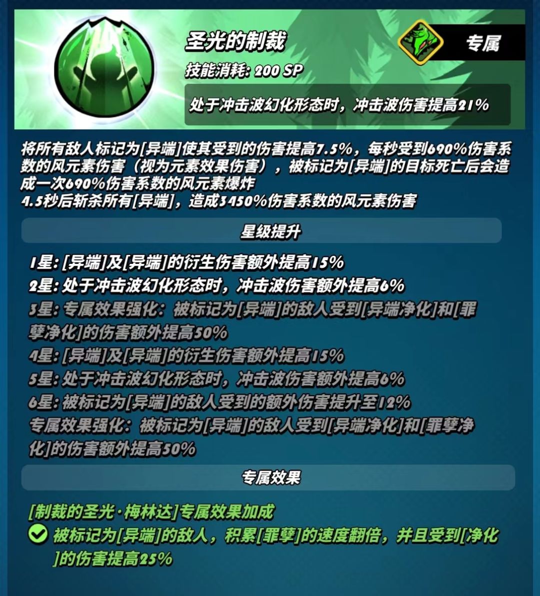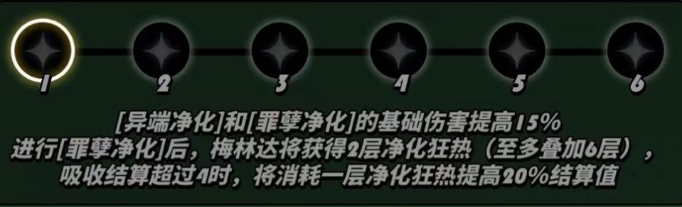 一星:提高异端净化和罪孽净化的基础伤害,在触发罪孽净化后可以获得两次提高吸收结算值的能力