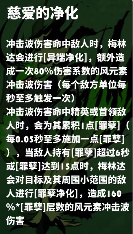 慈爱的净化:梅林达的冲击波伤害命中敌人时,会造成一次[异端净化]的风元素冲击波伤害,冷却时间为一秒,冲击波伤害命中精英或首领刮人时会为其累积1点[罪孽],冷却时间0.05秒,当敌人持有[罪孽]超过6秒或[罪孽]达到15点时,梅林达会对目标及其周围小范围的敌人造成[罪孽净化]的风元素冲击波伤害