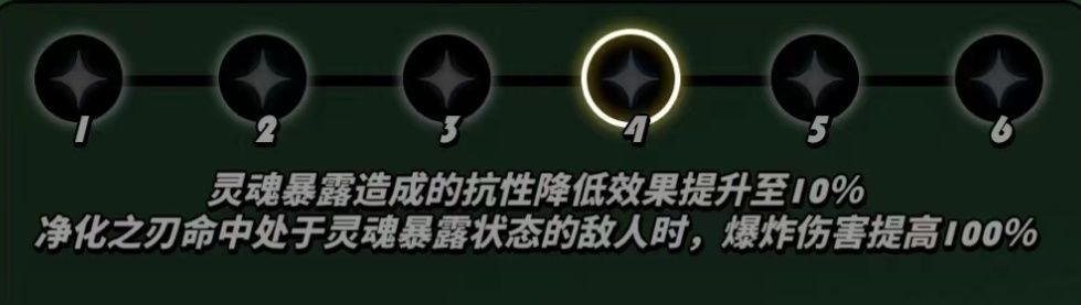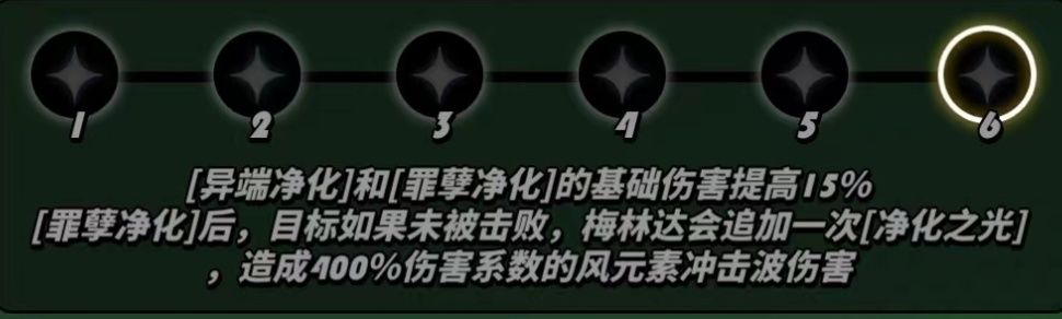 六星:提高异端净化和罪孽净化的基础伤害,在罪孽净化结算后追加一次风元素冲击波伤,即罪孽净化结算后可以立即为敌方添加2点罪孽