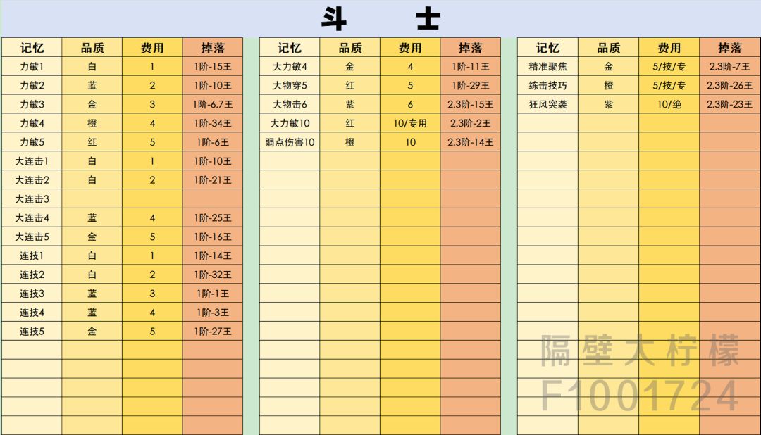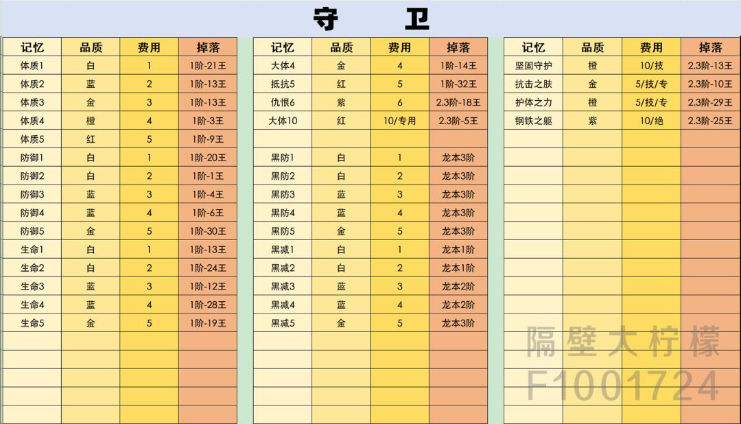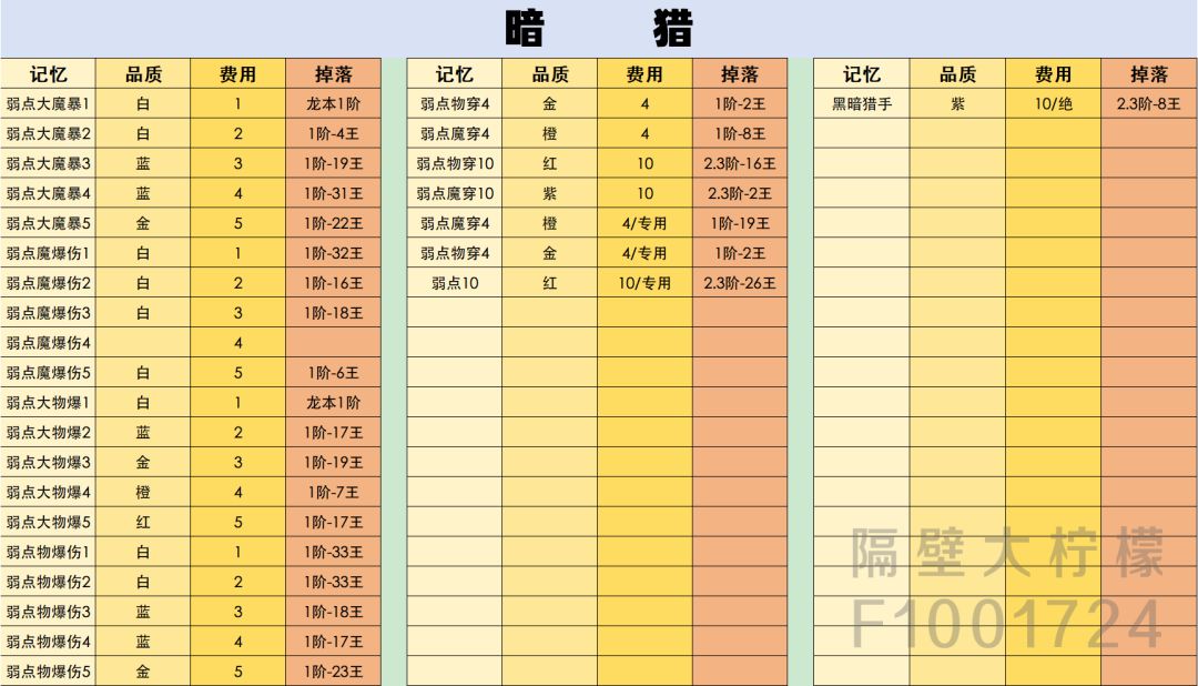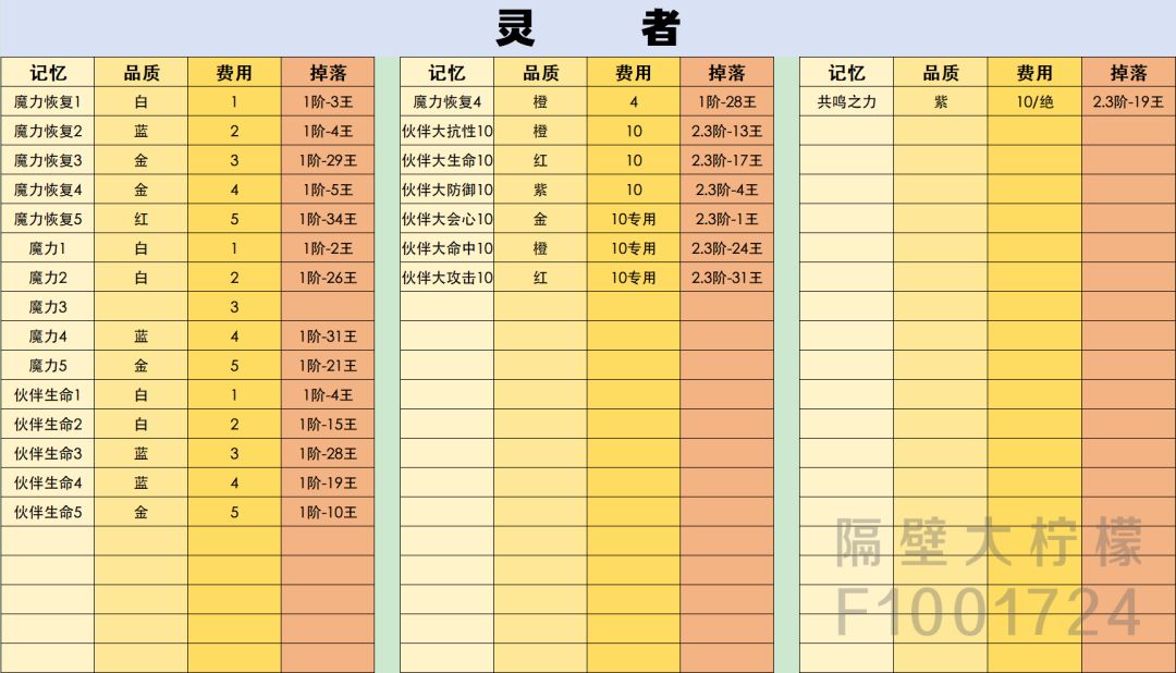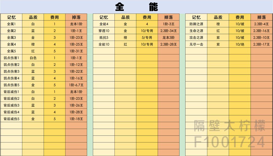 记忆的品质有六种:白,蓝,金,橙,红,紫。更具颜色的不同掉落率也不一样,最容易的是白,最难的是紫。