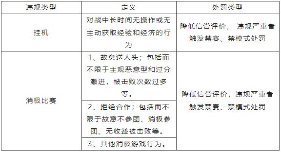 2、信誉评价分扣除将依据违规严重程度倍增;违规严重程度评估包含而不限于:挂机时长、消极比赛频率及同账号多次、多类违规情况等