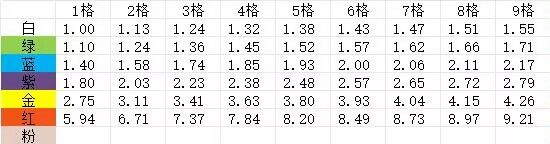 目前同品质同格子每个等级的属性差距是基础属性(1级冥器)的2.44%
