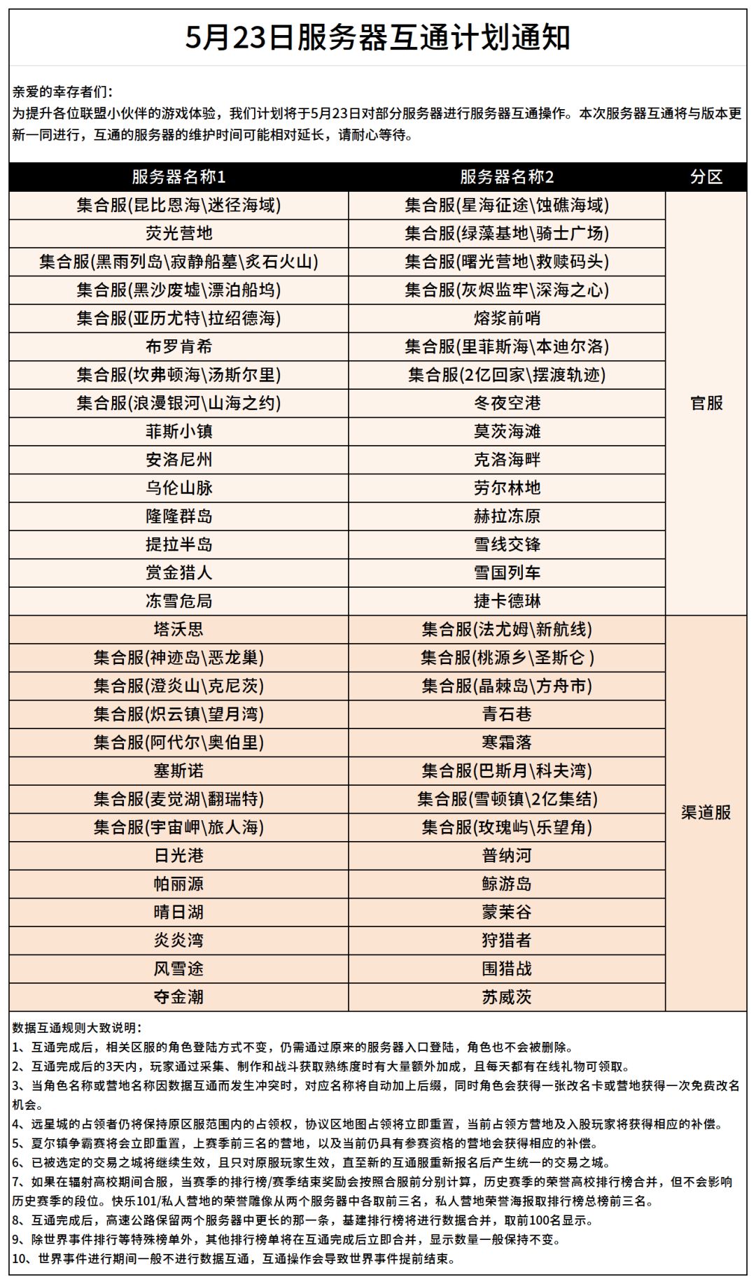 幸存者们久等了!明明来播报关于5月23日服务器互通计划通知啦,这次共有29组互通的服务器。