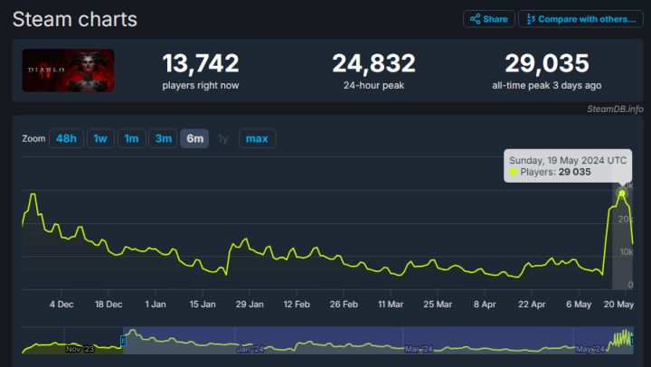 自《暗黑破坏神4》第四赛季“寻宝重生”推出以来,游戏收获了大量好评,口碑持续上升。据Steamdb数据显示,该游戏在Steam上的同时在线人数创下新高,达到了29035人。