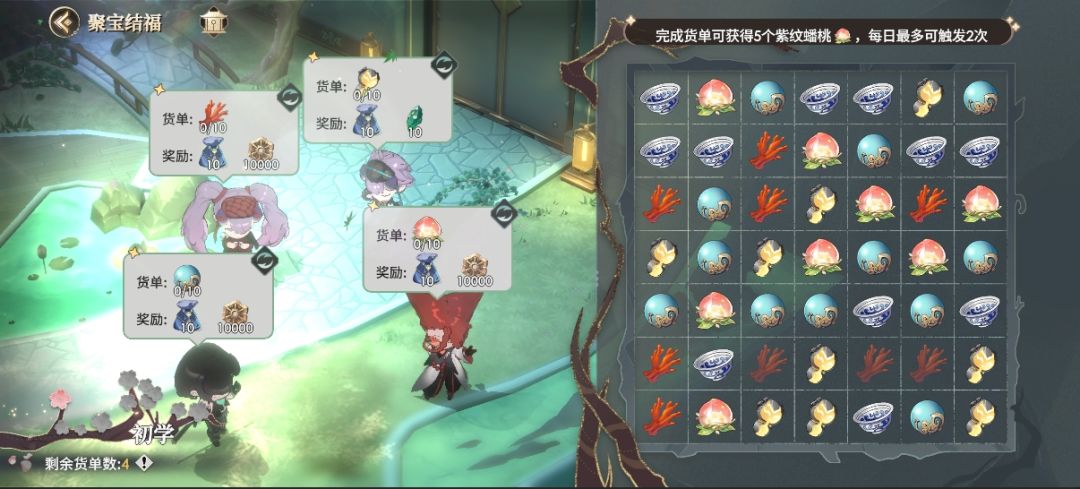 同样聚宝结福玩法在蟠桃会期间也进行了调整!桃子现在成为了三消的新元素!每完成一个衍灵货单,即可获得5个紫纹蟠桃,每日最多触发2次。