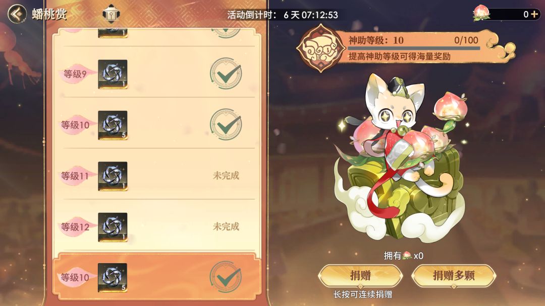 在小游戏玩法中获得的“紫纹蟠桃”可以在蟠桃赏功能中进行捐赠,捐赠可以提高神助登记,每提高一个神助等级都可以获得万象灵引、随机灵核、灵响碎片等奖励!
