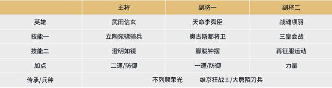 该阵容的输出核心为项羽,搭配【三皇会战】和【再征服运动】提供充足的输出,武田信玄充当主将,在【奥古斯都将卫】的加持下大幅度提高其技能的发动概率,自身携带可以提供突击技能发动概率和连击效果的技能,使得其可以在一回合内多次打出普攻、多次发动技能为对面施加沉默效果。