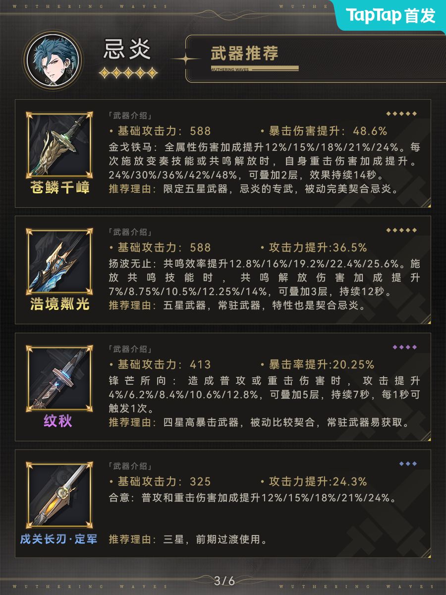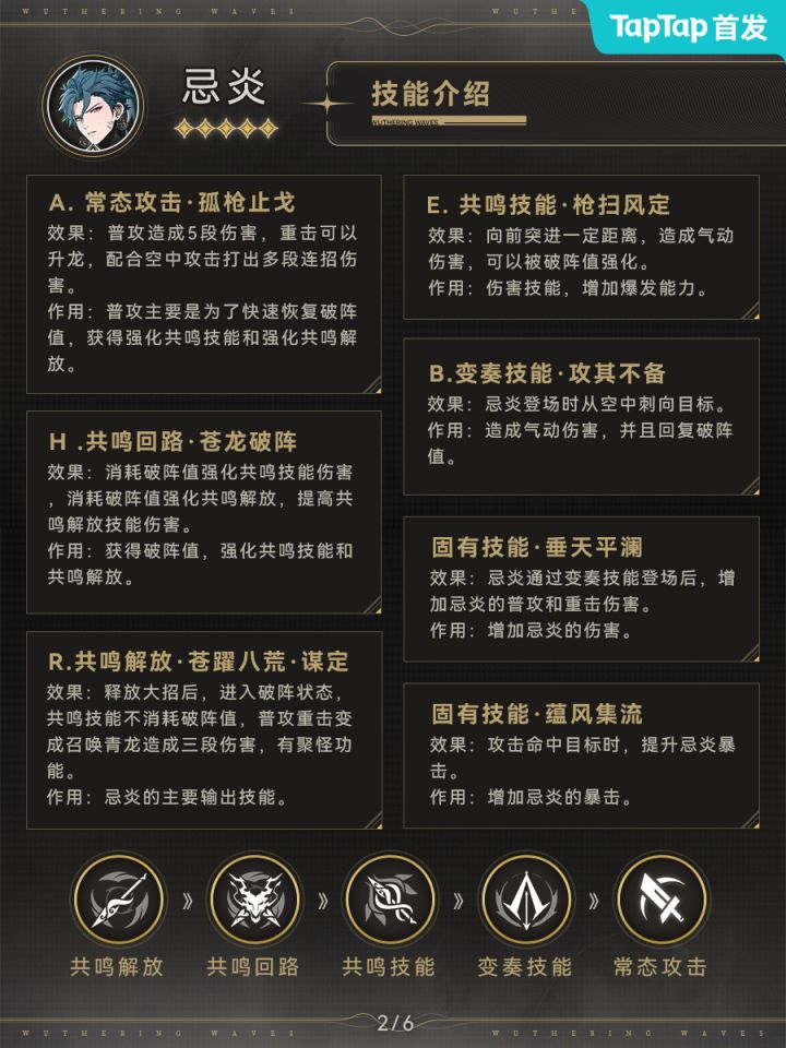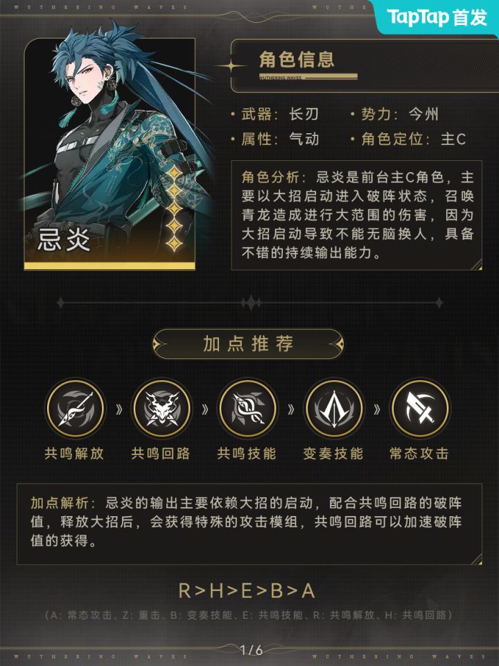 忌炎是鸣潮开服第一个UP池角色,作为主C有着优秀的输出能力,是前期开荒不错的选择。忌炎大招具备削韧和聚怪能力,输出手感和大世界体验比较舒适。但鸣潮目前没有长轴辅助,而忌炎的技能决定了他需要长时间站场。因此忌炎作为长轴输出吃拐能力偏弱,如果追求短时竞速,卡卡罗等角色是更好的选择。