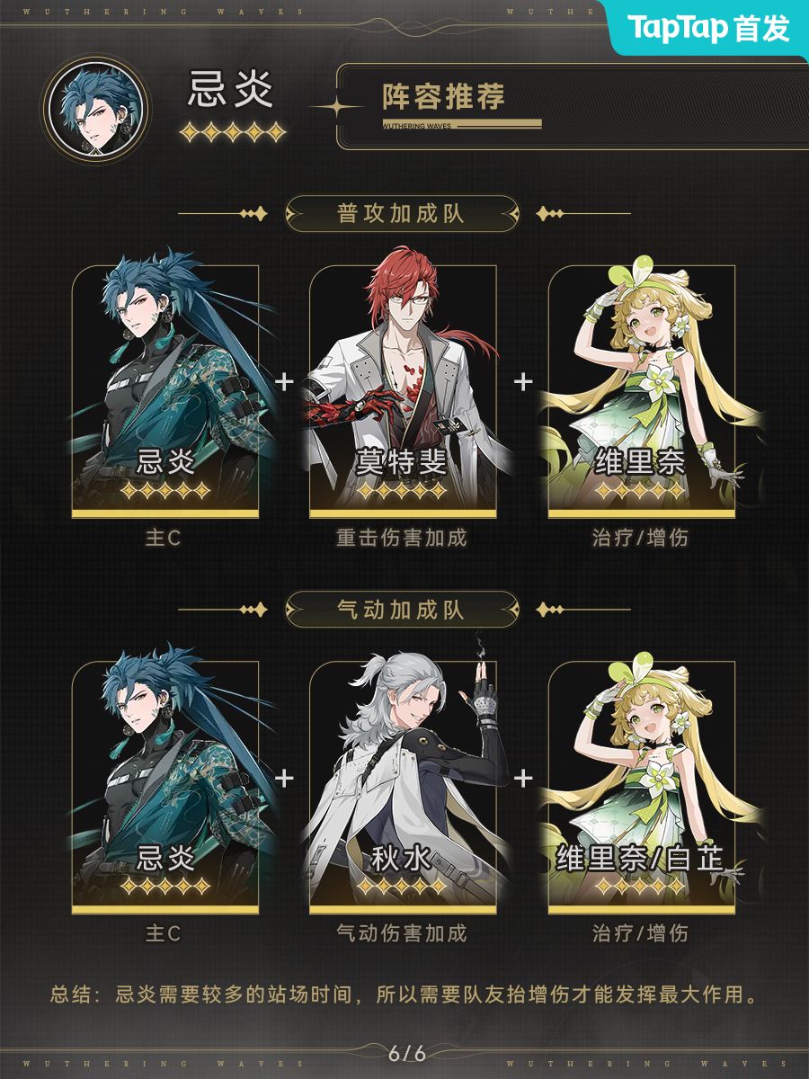 忌炎的输出主要依赖大招的启动,需要比较多的站场时间,所以需要队友给与增伤才能发挥最大的作用。队友优先选择秋水/莫特斐这种能够增加气动/重击伤害的角色,以及维里奈/白芷等辅助角色保证队伍续航。
