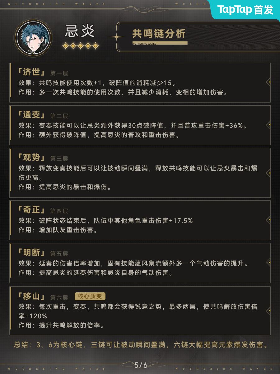 忌炎0链可用,如果打算氪金抽共鸣链推荐以3链和6链为目标。