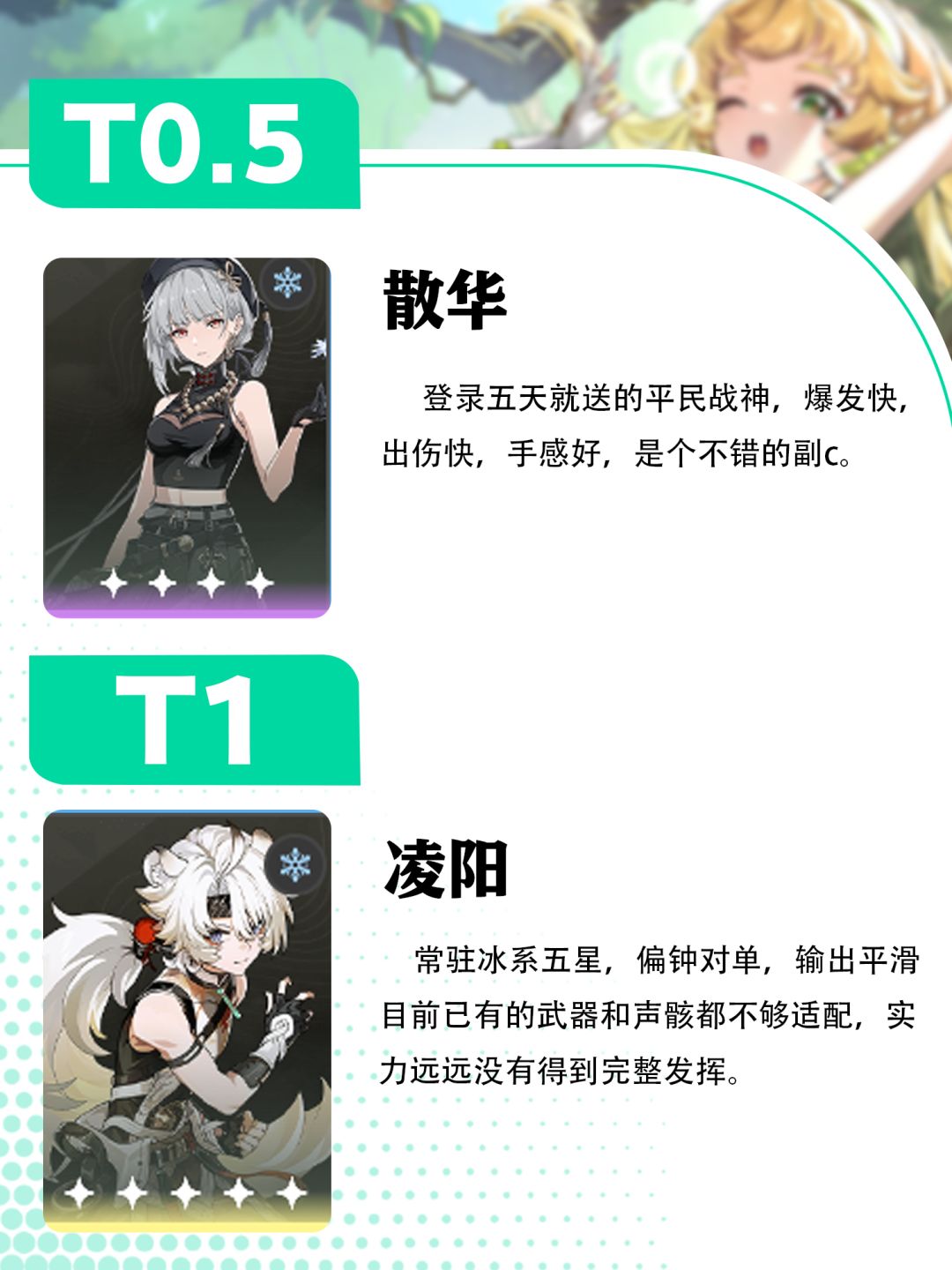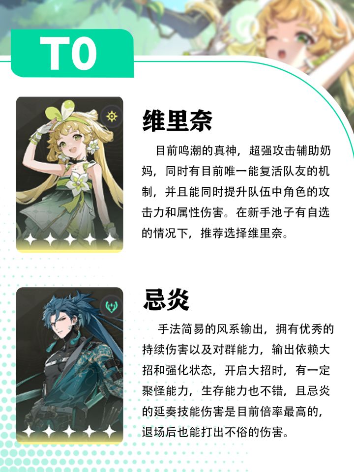 鸣潮终于公测啦,这次给大家整理了一份鸣潮的开服角色强度榜,抽到强度类的角色可以优先练起来,如果你是xp党可以无视此榜单,榜单仅供参考,如有错误欢迎提出纠正