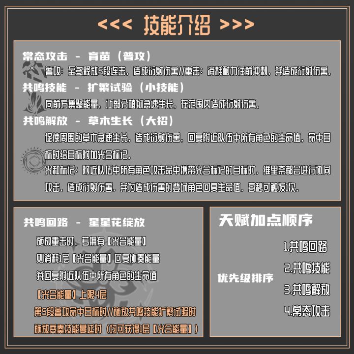 而维里奈治疗方面主要是围绕共鸣回路展开,通过重击来消耗光和能量达到治疗的效果,所以在技能加点时可以作为优先升级