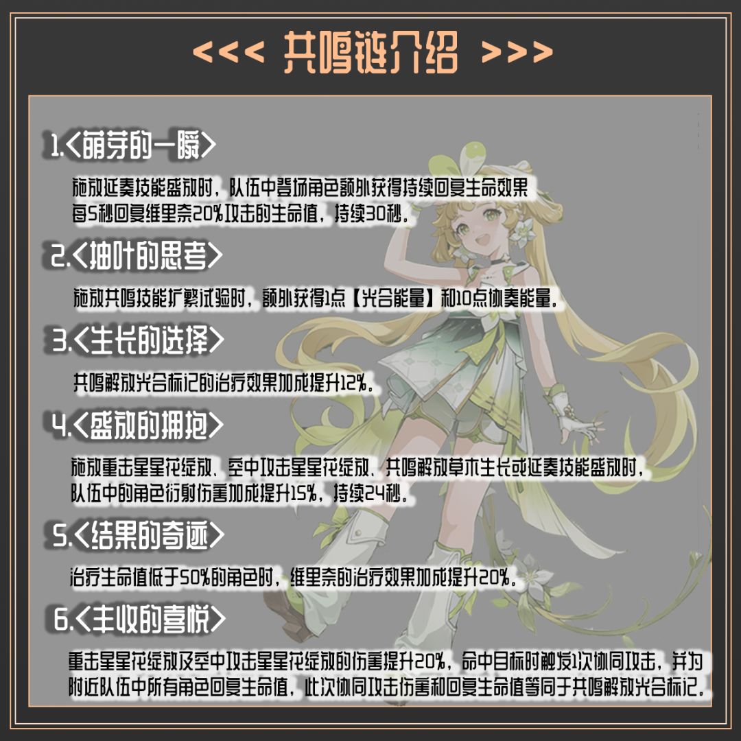 共鸣链主要在于二和六的提升十分巨大,二链可以加快我们获取光和能量和协奏能量的效率,大幅加快我们的战斗节奏。六链则是提升维里奈的重击攻击,让我们的伤害和治疗效果更为强力。