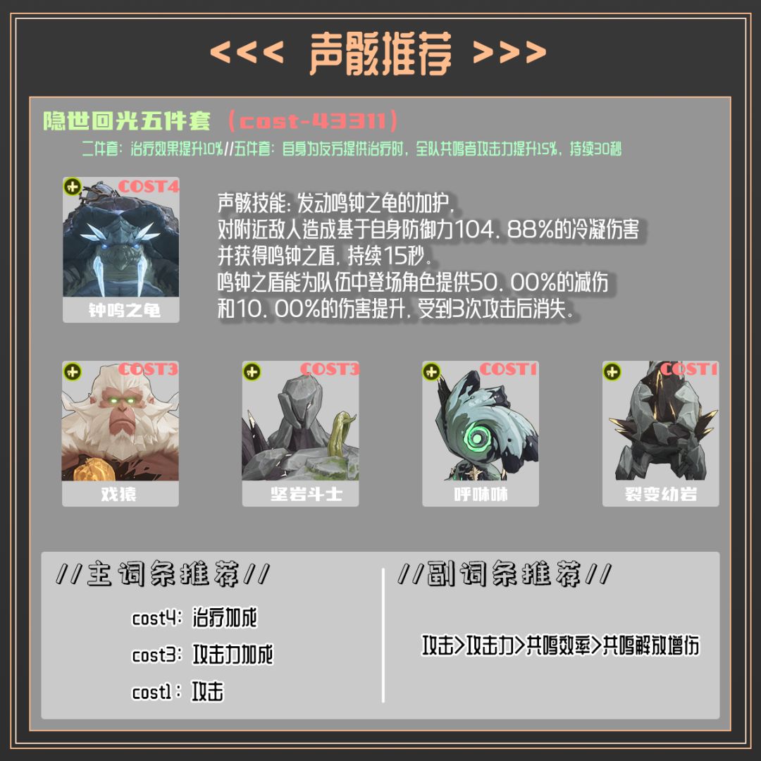 声骸选择治疗必备的“隐世回光”5件套,提高维里奈的治疗效果和队伍增伤能力。一号位可以选择cost4的鸣钟之龟,不论是前期还是后期这样的减伤和增伤效果都是非常有用的,也提高的整体队伍的容错。