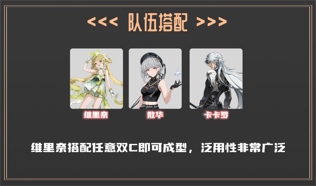 维里奈作为万金油治疗,队伍方面搭配双C就可以了,泛用性十分广泛。