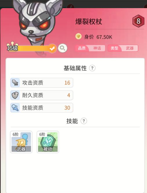 人物详情:武器:武器发动后,攻击敌方随从10次,有5%几率攻击敌方世界之子,攻击随从期间获得75%减伤