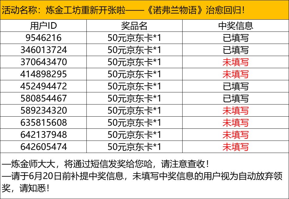 已中奖的炼金师将通过短信发奖,还请未提交中奖信息的玩家尽快补充中奖信息哈,我们收到后会尽快安排发奖,祝大家每天开心,更重要的是:多来参与【诺弗兰物语】的福利活动哦!