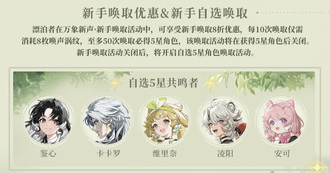 开荒角色选择:由于鸣潮在50抽的新手池子结束后(实际只用40抽),会开始自选5星角色换取活动,其中可以自选的角色分别是鉴心、卡卡罗、维里奈、凌阳、安可,其中开荒建议首选t0奶妈维里奈,维里奈不仅有独一份的免死机制,并且攻击辅助能力也是一流;如果新手池子抽出维里奈,自选就建议卡卡罗,毕竟后面有吟霖,不过目前不确定后面今汐的属性,建议大家提前做好被爆金币的准备