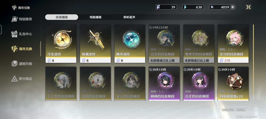 抽卡资源:余波珊瑚优先换取角色频段,残振珊瑚优先换取浮金波纹