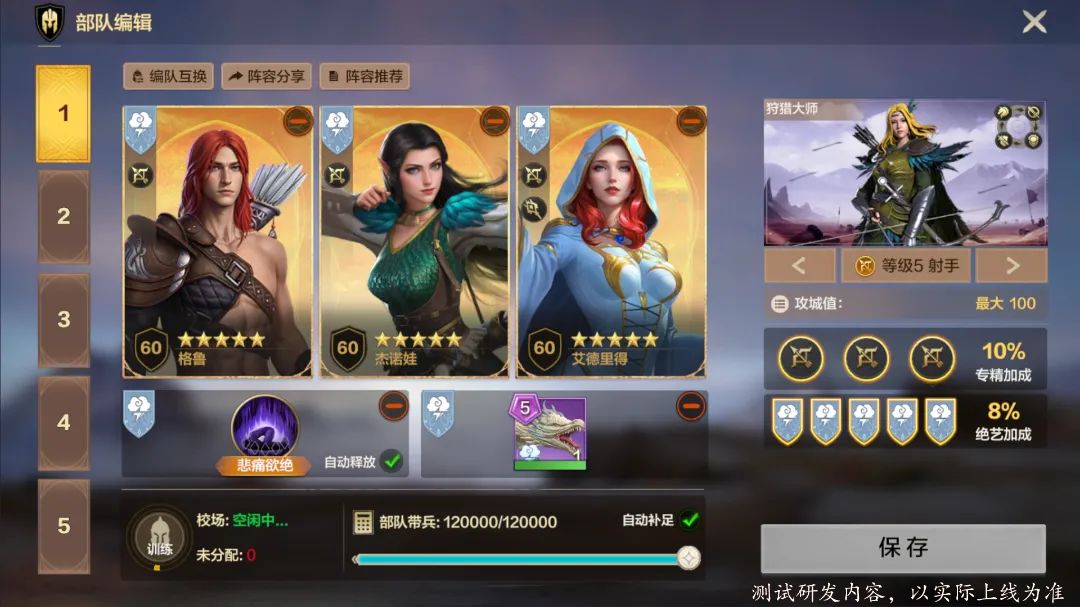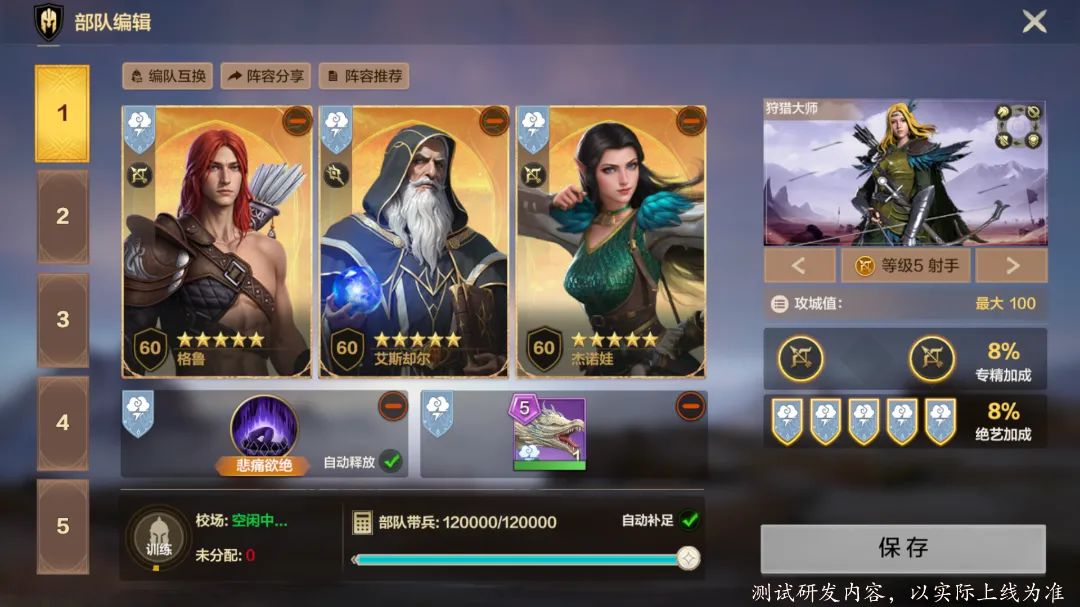 队伍构成:气系射手队伍终极阵容,可以获得全额绝艺和兵种属性加成,格鲁是阵容核心辅助定位,杰诺娃、艾德里得作为主要输出。
