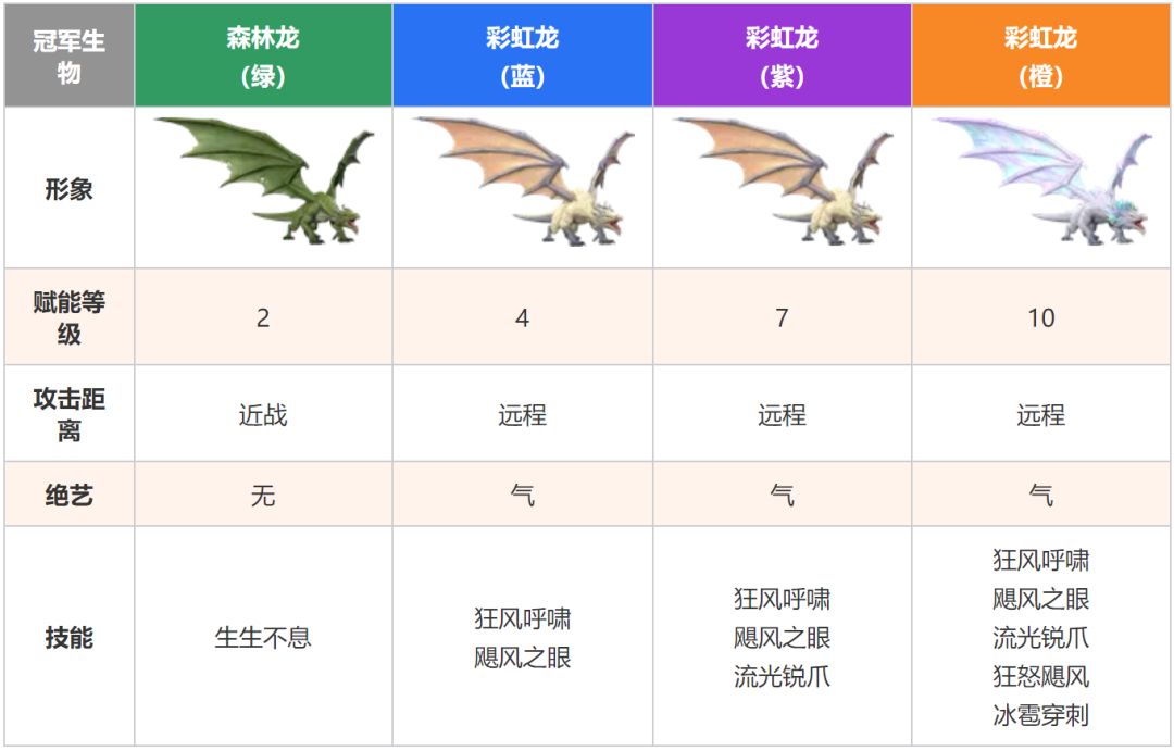 森林龙可以继续培养进阶为翡翠龙、彩虹龙和金龙等传说中的冠军生物,本期凯莉就为大家揭开彩虹龙的神秘面纱,一起来先睹为快吧!