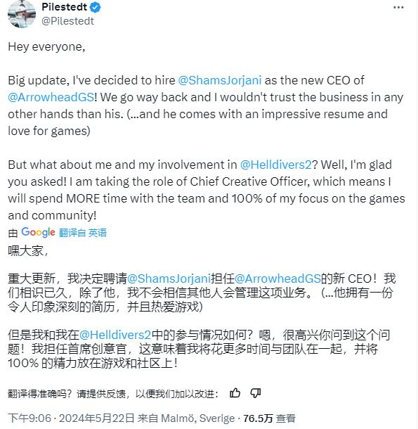 听说《绝地潜兵2》制作组 Arrowhead Games 的CEO位置有大变动啦!👀 现任CEO Johan Pilestedt(图二这位酷酷的大佬)昨天发了个好消息,说他要退居二线,把CEO的宝座让给新聘请的猛将Shams Jorjani(图三这位笑容满面的小哥哥)啦!🎉